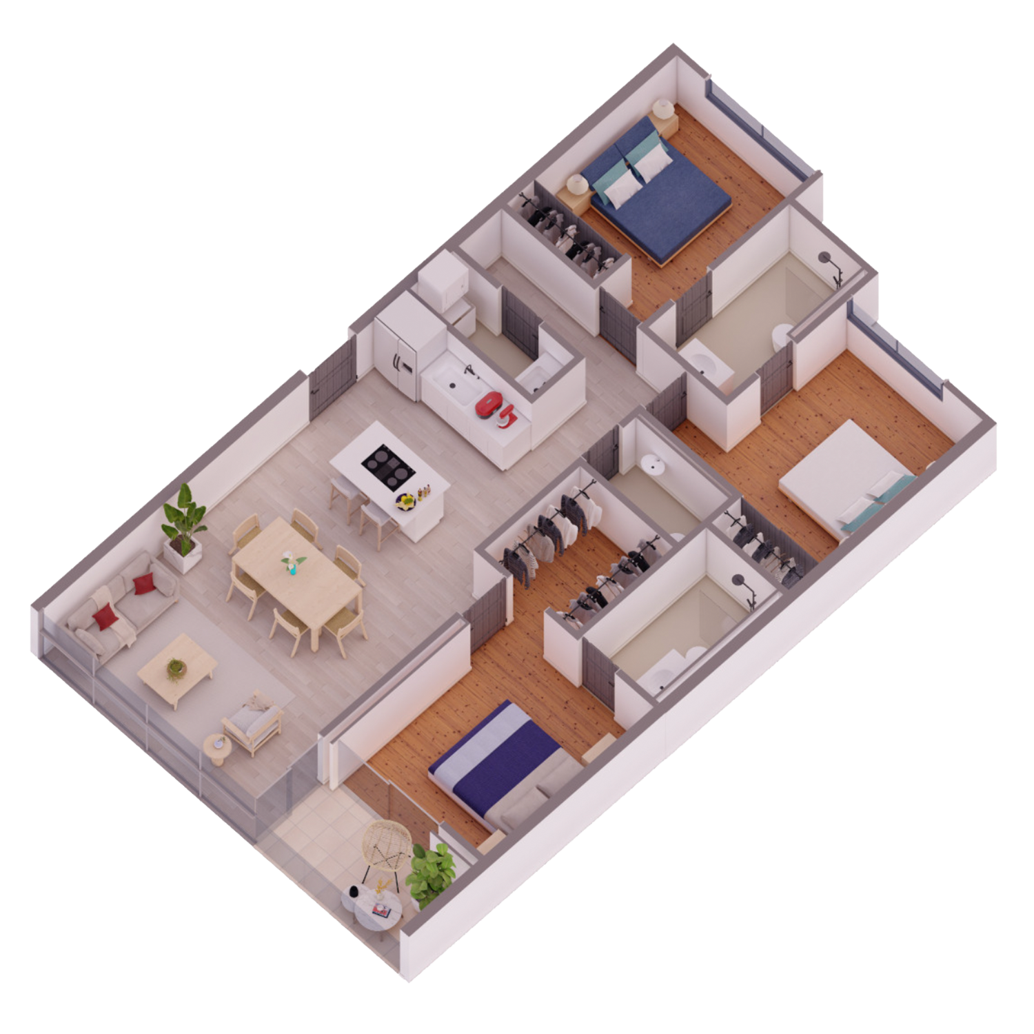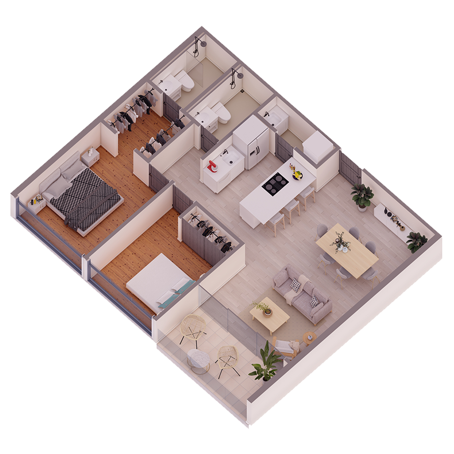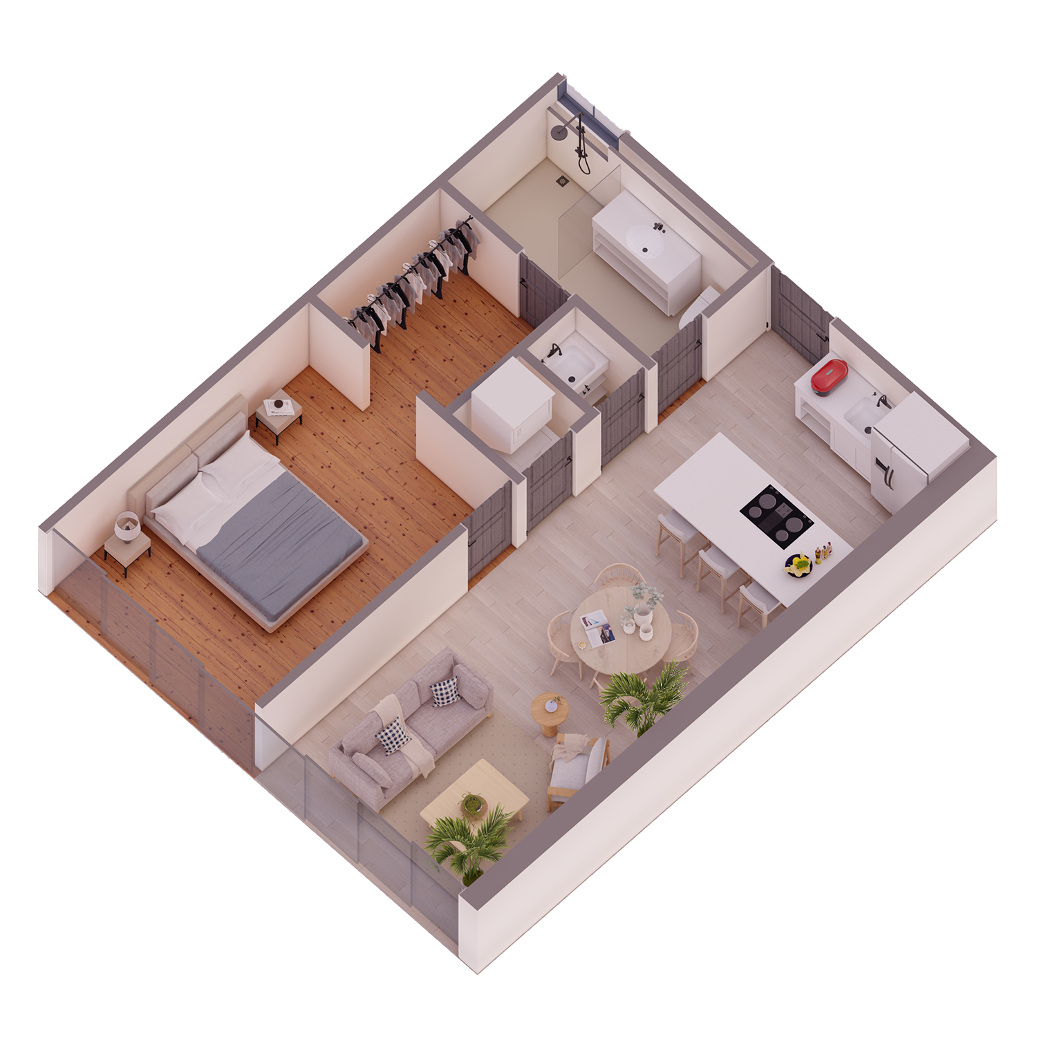 Diseñados pensando en tu bienestar, nuestros apartamentos disfrutan de iluminación natural y cielos altos. Con un área social y cocina en concepto abierto que integra una amplia terraza y vistas al bosque en la mayoría de nuestros modelos.